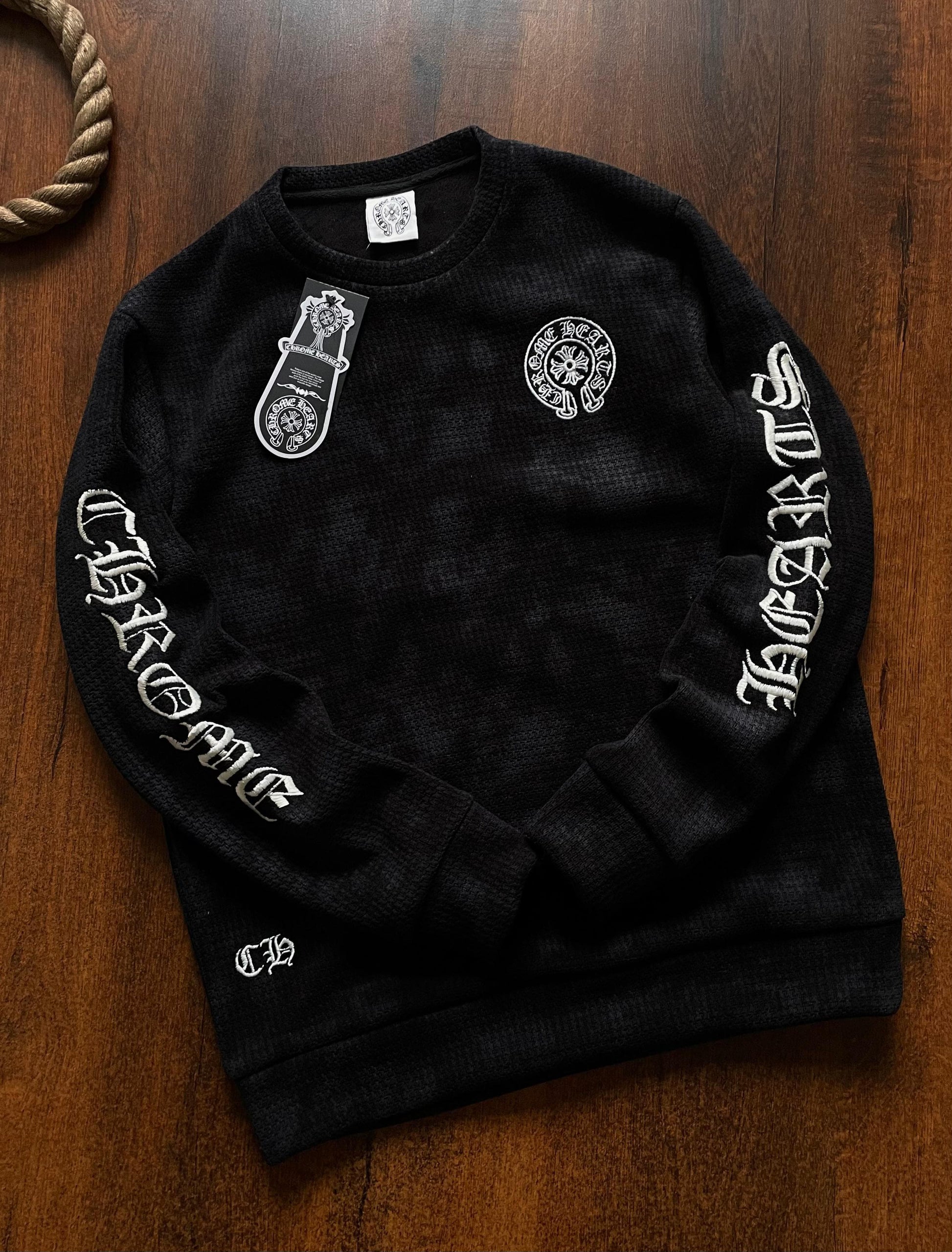 These premium Chrome Hearts waffle-knit sweatshirts blend luxury craftsmanship with streetwear edge. Featuring signature Old English sleeve embroidery and horseshoe chest branding, these pieces offer a sophisticated, textured aesthetic. Designed with a classic crewneck silhouette and ribbed trims, they deliver effortless style and comfort for the discerning collector.